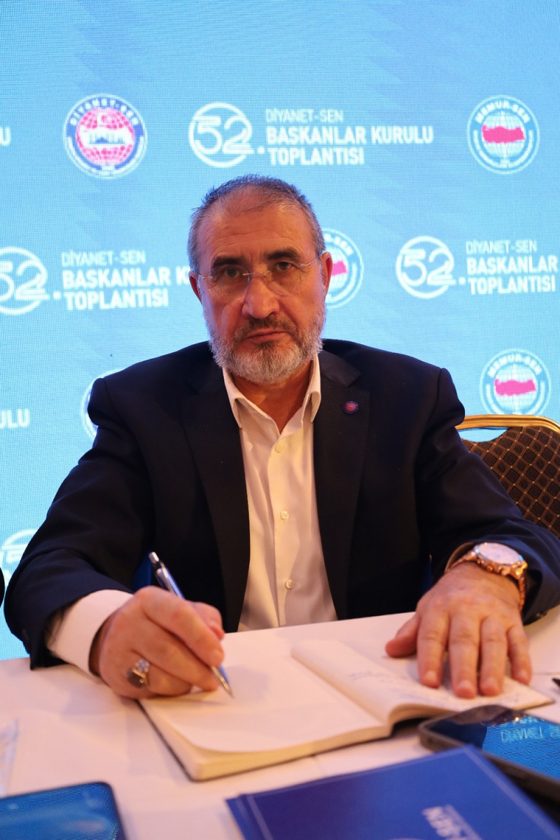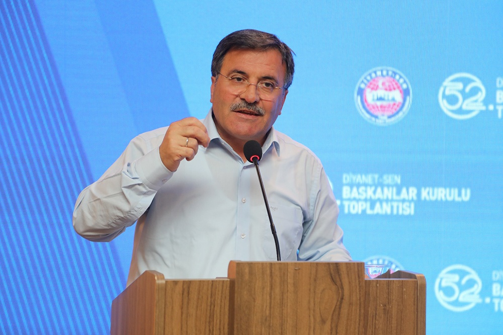 Dizelerini atıf yaparak “İşte bizler “buyruğun” getirdiği sorumlulukla medeniyet ruhunu milletle buluşturan teşkilatız. Biz sendikacılık yaptığımız kadar insanlık yükünü de sırtlayan bir hareketiz. Diyanet-Sen’li olmak bu davayı namus bilmek, Davayı hor ve öksüz koymamaktır. Çünkü biz medeniyet hamilleriyiz. Biz kadim kültürümüzün birikimiyiz. O nedenle yükümüz ağır, işimiz çok, yolumuz uzun. Bu ağır sorumluluğu taşımak kolay değil.Bunun için hem kemiyeti büyütmek, hem de keyfiyeti artırmak zorundayız. Sahada adım atılmadık yer bırakmamak, temas edilmedik din görevlisi, vakıf çalışanı koymamak zorundayız. Taşıdığımız sorumluluğu hissetmeyen bir tek işyeri temsilcisi kalmamalı. Bir tek teşkilat mensubu bile unutulmamalı. Bu büyük davada tek bir kişi bile önemli.Bu yüzden, hem bir adresi olmayanlara, hem de yanlış adreste olanlara gideceğiz.Kendimizi, derdimizi, kazanımlarımızı anlatacak, sayımızı daha da artıracak, heybeti daha büyütecek, bereketi daha da çoğaltacağız.” İfadelerine yer verdi.