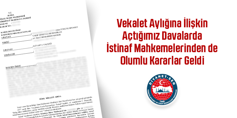 Böylelikle Diyanet-Sen, Türkiye genelinde vekil din görevlilerinin maaş mağduriyetine ilişkin açmış olduğu davalarda istinaf mahkemelerinden gelen yeni olumlu kararlarla hukuki başarılarına yenilerini ekledi.